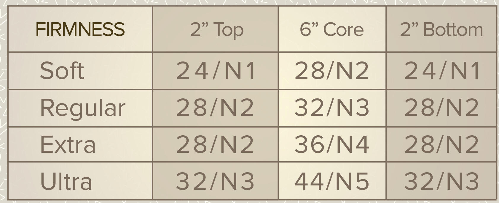 ![]() Available: Soft N1, N2, 24, 25 Regular Firm N3, 32 Extra Firm N4, 36 Ultra Firm N5, 44 |